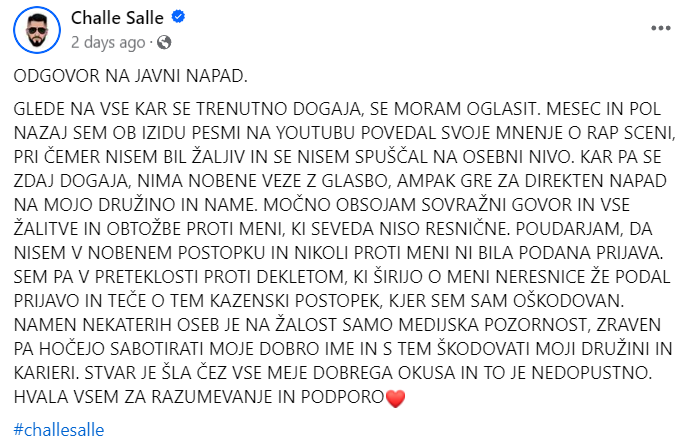 V redakciji NET TV smo v letu 2021 posneli dokumentarno oddajo o hip-hopu, in praktično vsi – od Klemna Klemna, EMKEJA, Drila, Masaye, Mita, Ntoka in do ostalih imen slovenske hip-hop scene – nihče ni rekel čez vas niti ene slabe besede. Kar se tiče kariere, smo ljudje različni, ampak vseeno, kako pa gledate na to, da vam je Challe Salle, ki naj bi bil mega zvezda hip-hop scene, naredil takšen »diss« v podcastu? Kako to osebno doživljate oziroma zakaj sta v bistvu sploh na bojnih linijah?